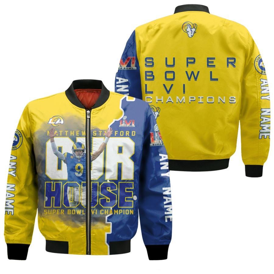 Los Angeles Rams Matthew Stafford 9 Underdog Super Bowl LVI Champions Gold 3D Allover Gift For Rams Fans Bomber Jacket DACA4126