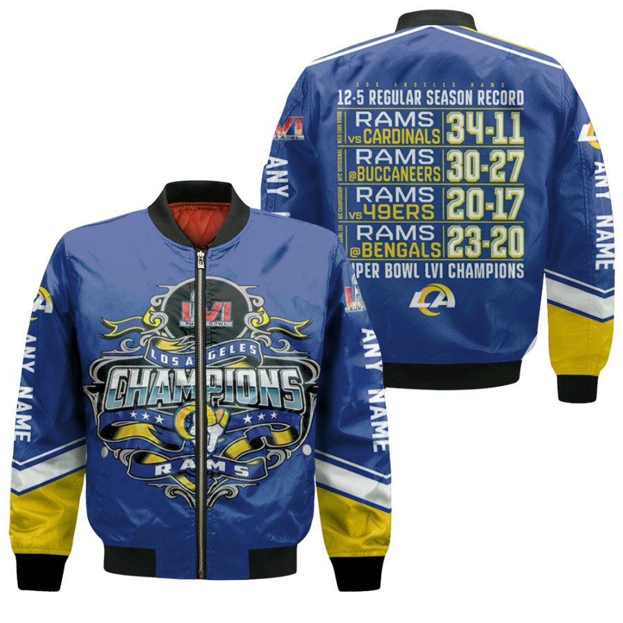 Los Angeles Rams Super Bowl LVI Champions Season Record Scores Match Blue Gift For Rams Fans Bomber Jacket DACA4114